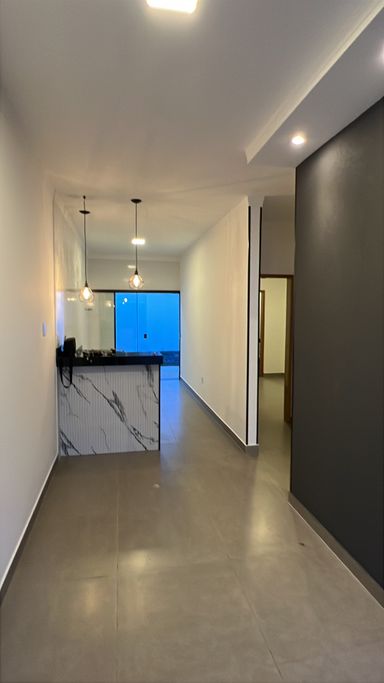 • Sala integrada com iluminação moderna, criando um ambiente acolhedor e elegante